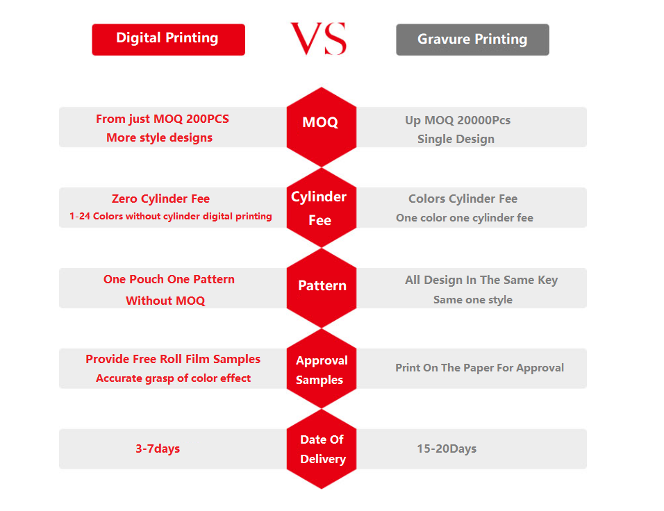 When selecting between gravure printing and digital printing for your plastic packaging needs, it’s crucial to consider factors such as order volume, budget constraints, design complexity, and lead times. For large-scale productions with consistent artwork and longer print runs, gravure printing may offer the best value proposition. Conversely, digital printing is an excellent choice for businesses seeking flexibility, customization, and cost-effective solutions for smaller print runs or variable data printing projects.